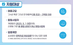 - 지원 대상: 2025년 5월 1일 이전 개업, 2024년 또는 2025년 연 매출액 3억 원 이하인 소상공인.